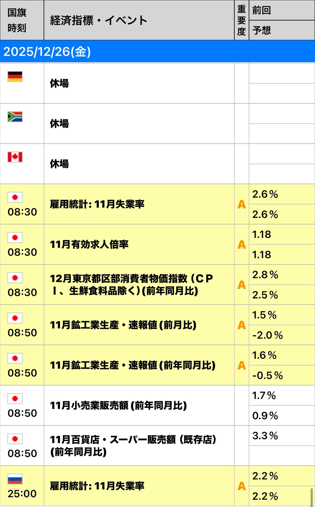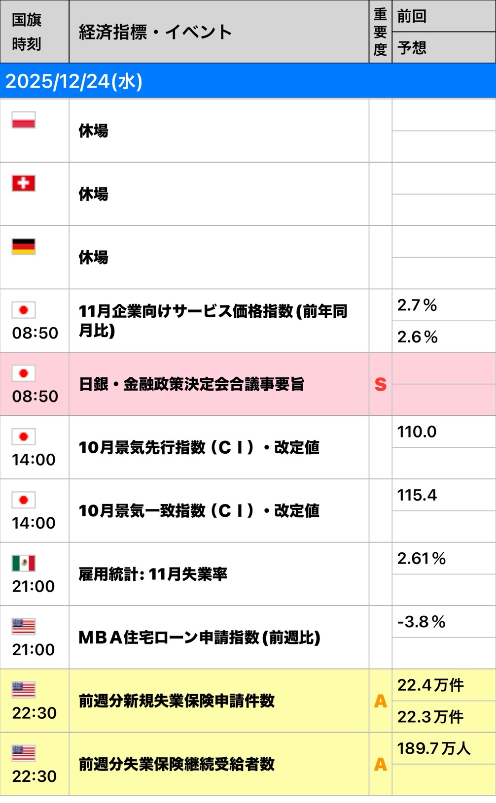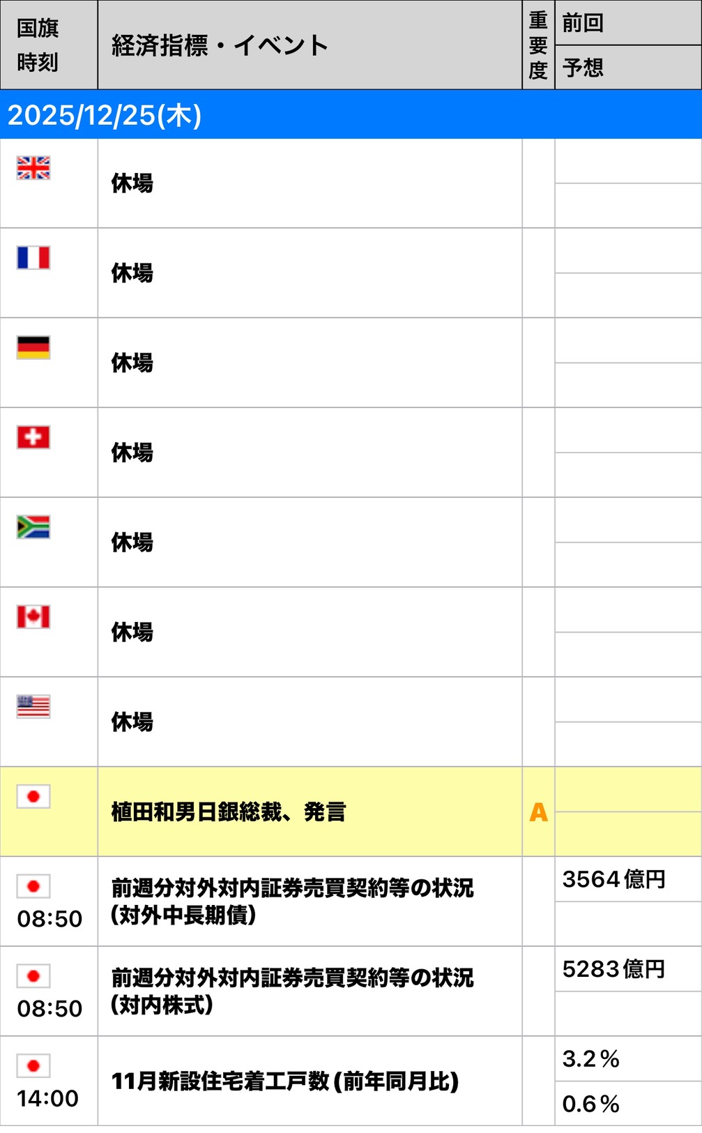 - 📌 12月26日(金)は米市場再開の日ですが、指標は少なく、流動性低のまま推移する可能性があります。