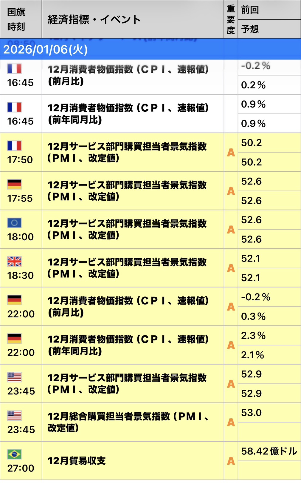 - 1月6日(火):各国 サービス部門PMI(欧・英・米)