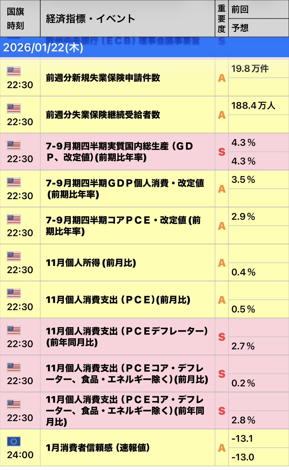 - 1月22日(木) — 米 PCE(個人消費支出価格指数)&コアPCE および GDP データ