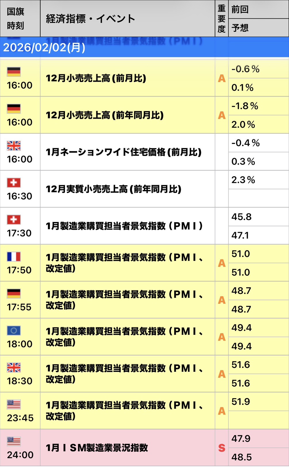 - 2月2日(月) — 中国および欧米の製造業 PMI 公表(PMI は景況感指標)