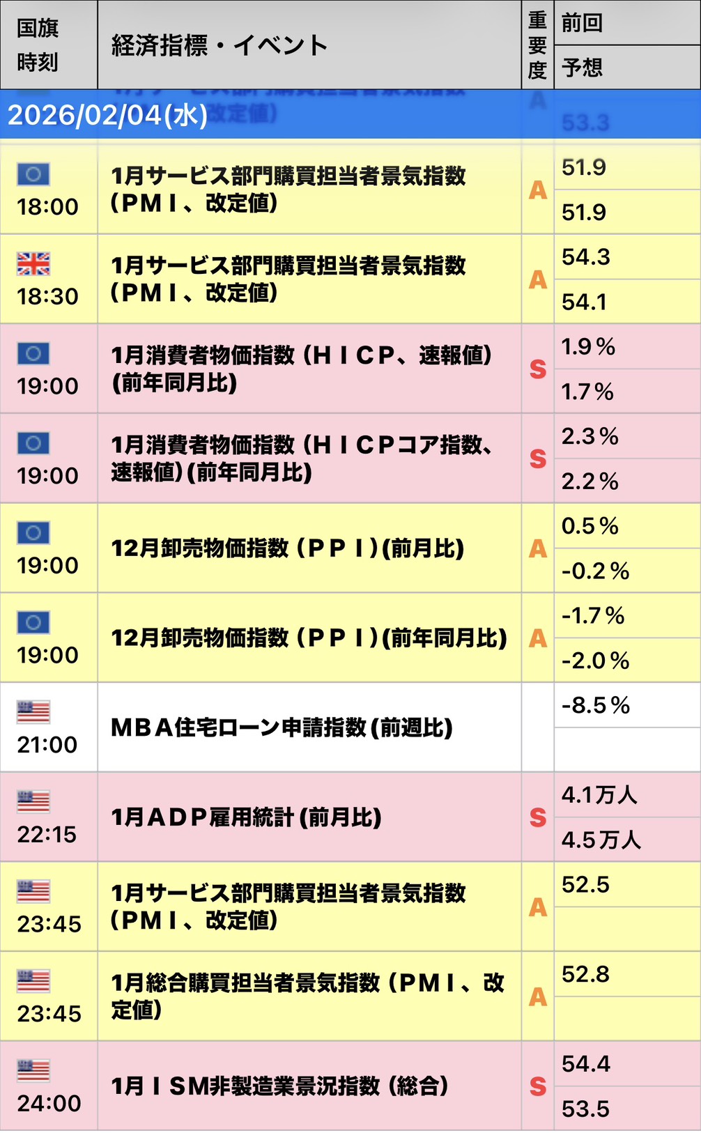 - 2月4日(水) — 中国サービス業PMI、ユーロ圏 CPI、米国 ADP雇用統計、米 ISM非製造業 PMI