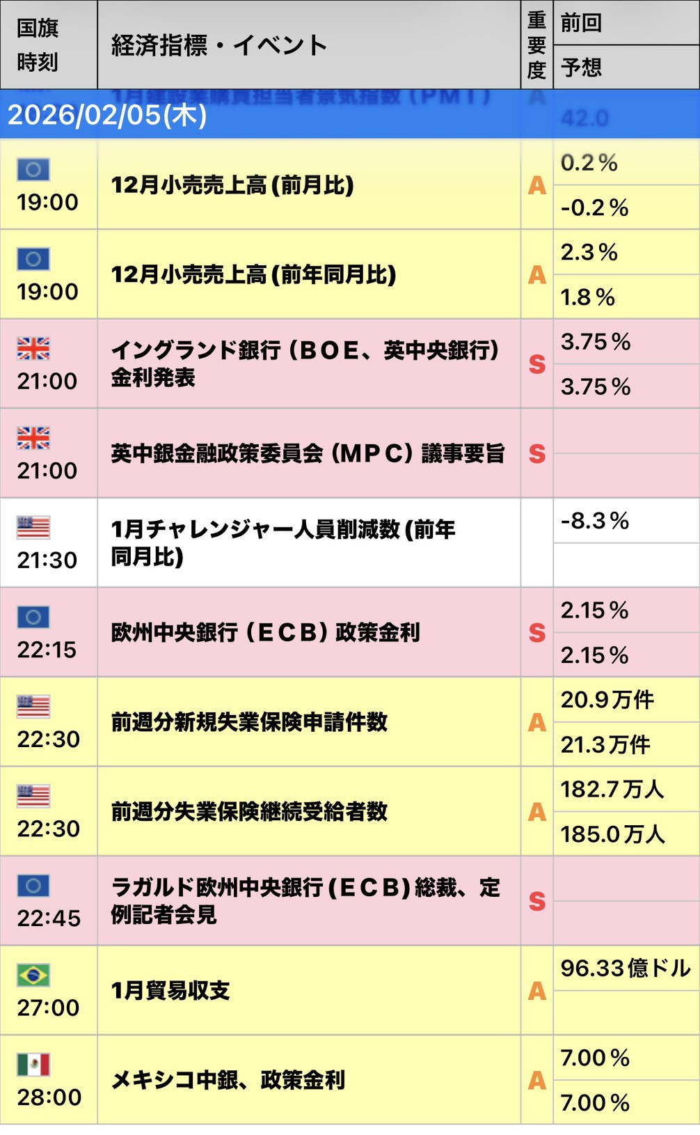 - 2月5日(木) — ECB(欧州中央銀行)政策金利発表、英国中銀)
