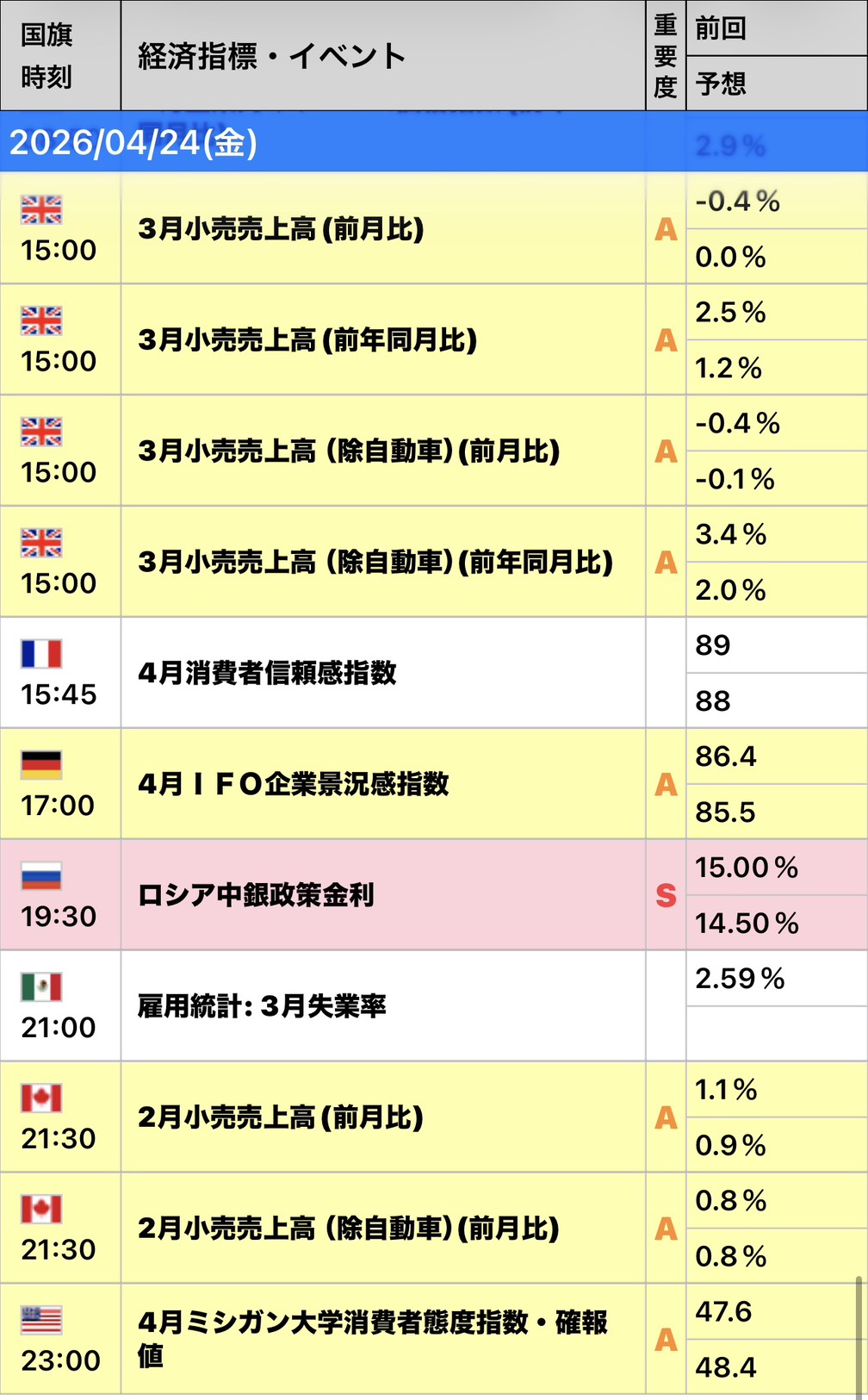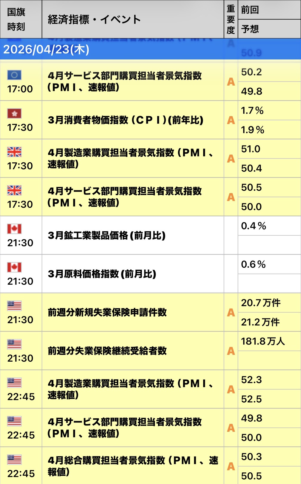 4月20日(月) ~ 4月24日(金) の経済指標カレンダー