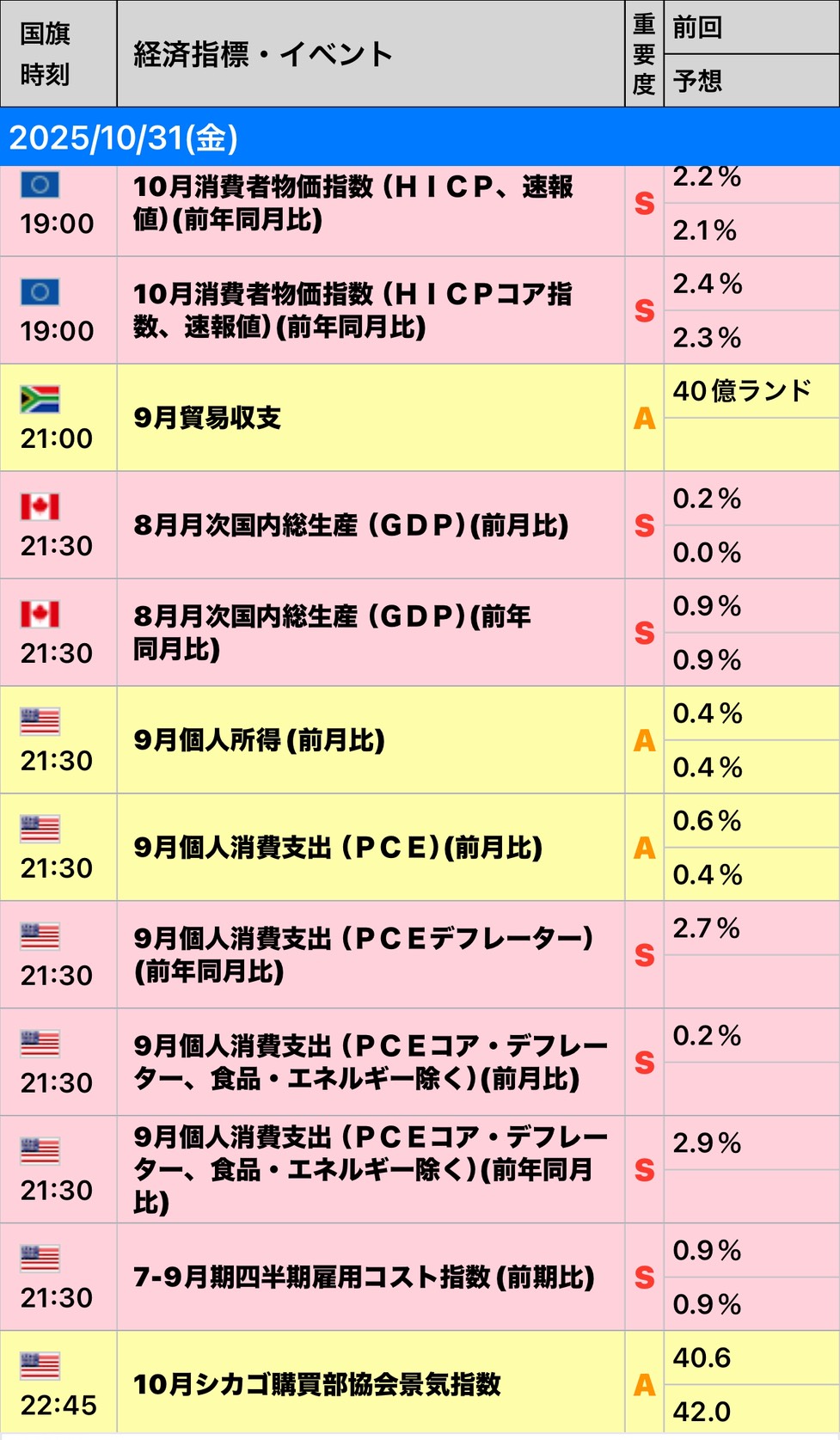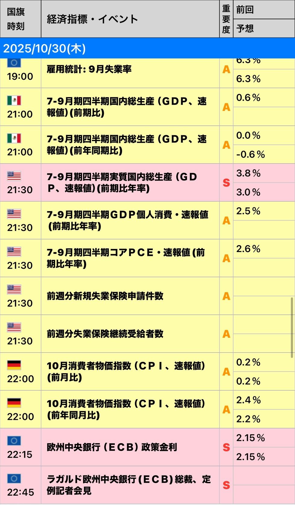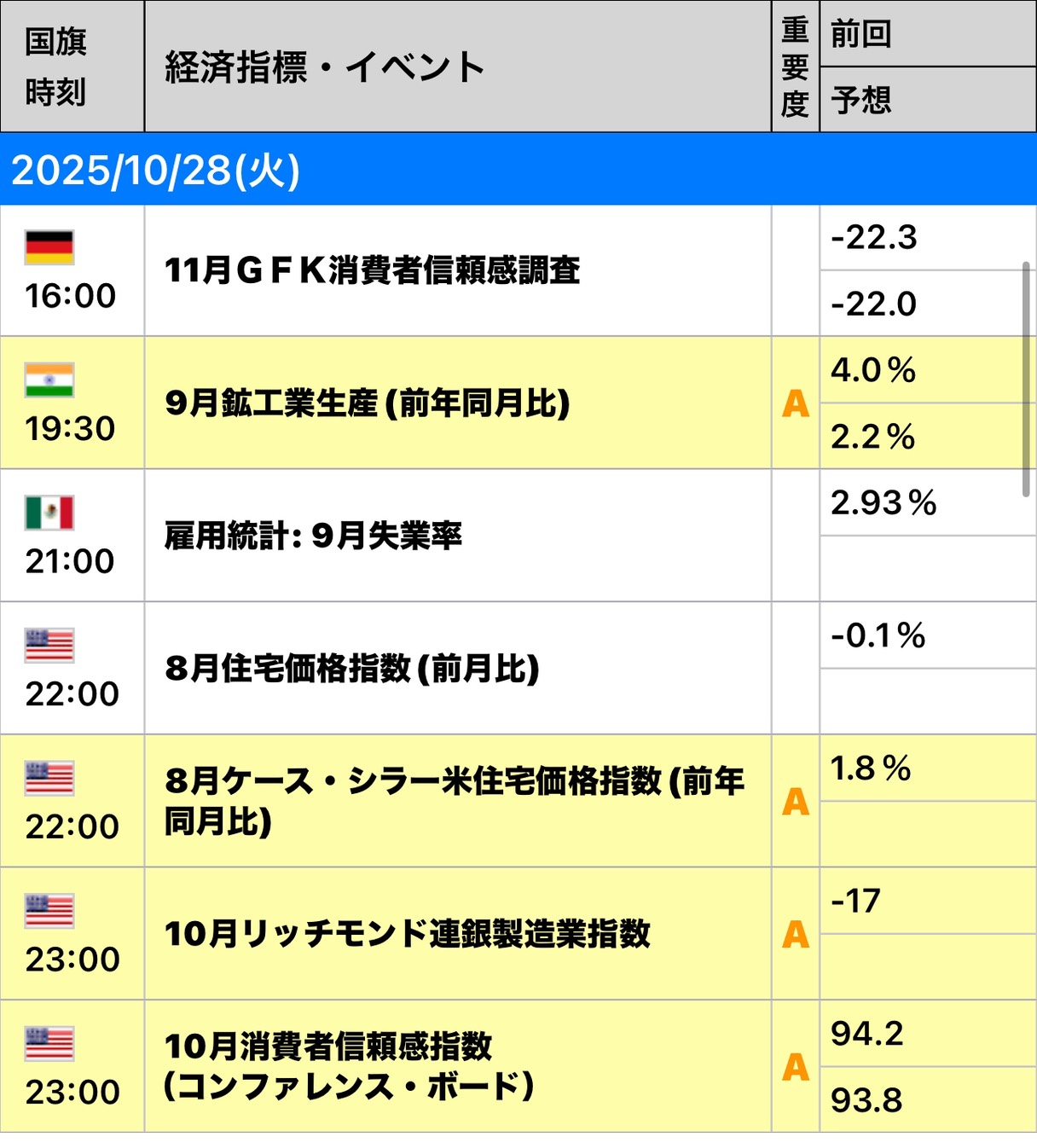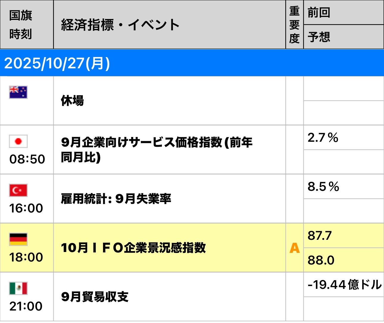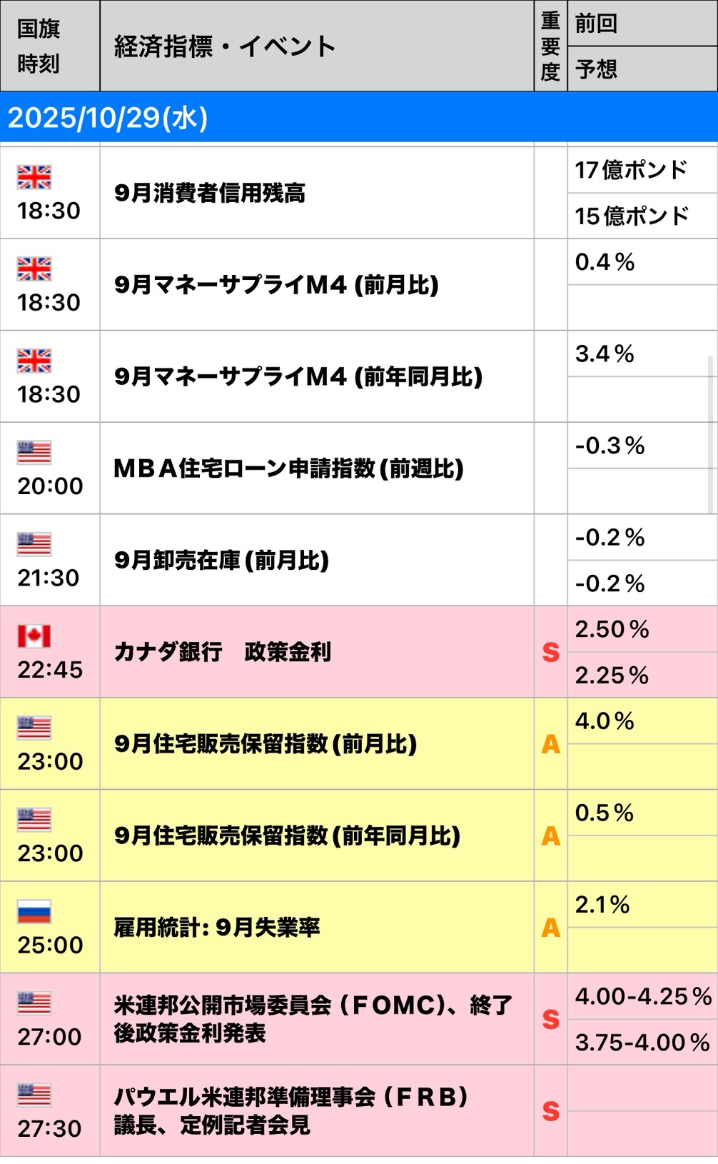 - 🟣 2025/10/29(水):米国の主要な金利・政策関連イベントや FOMC 発表の注目がある週(市場センチメントが影響)。
