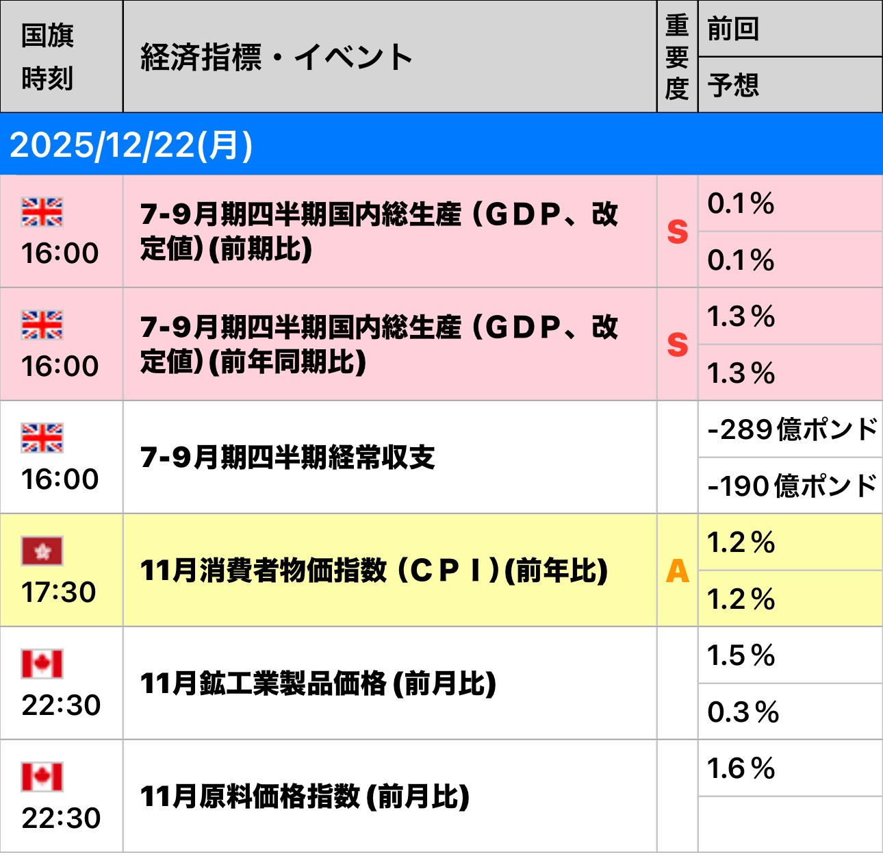 - 📌 全体的な経済指標は非常に少ない週です。米国・欧州の主要市場はクリスマス前後で休場・早終い。