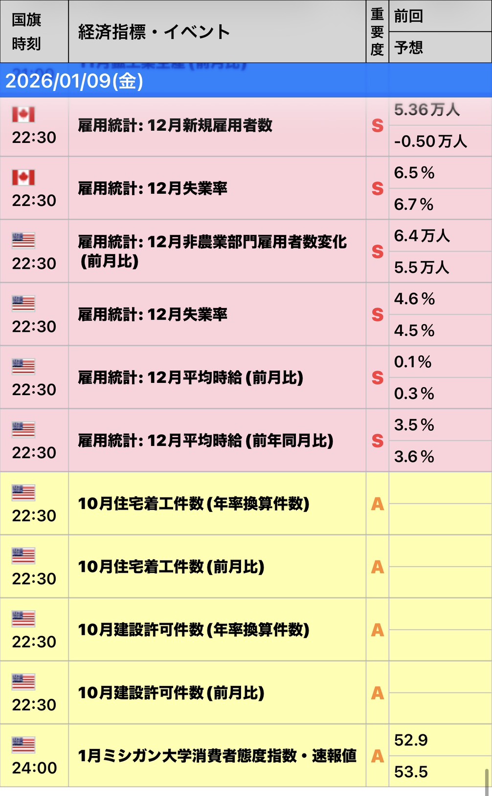 - 1月9日(金):超重要 ⚠️ 米雇用統計(Nonfarm Payrolls) + ミシガン消費者信頼感指数