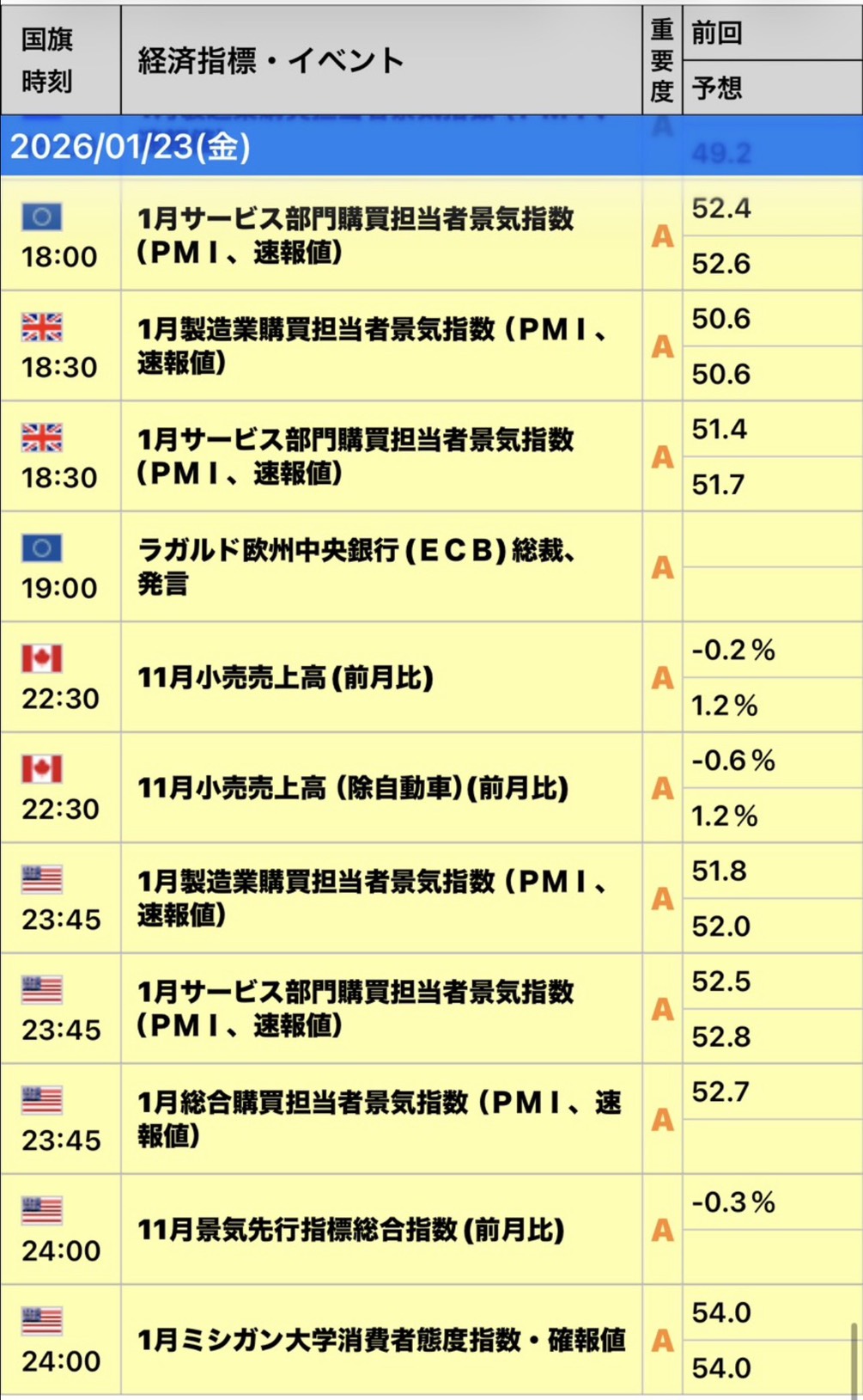 - 1月23日(金) — S&P Global PMI(製造・サービス速報値)、ミシガン消費者信頼感指数 など