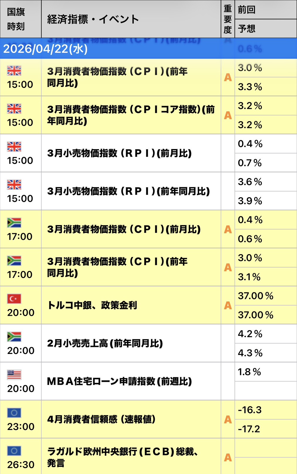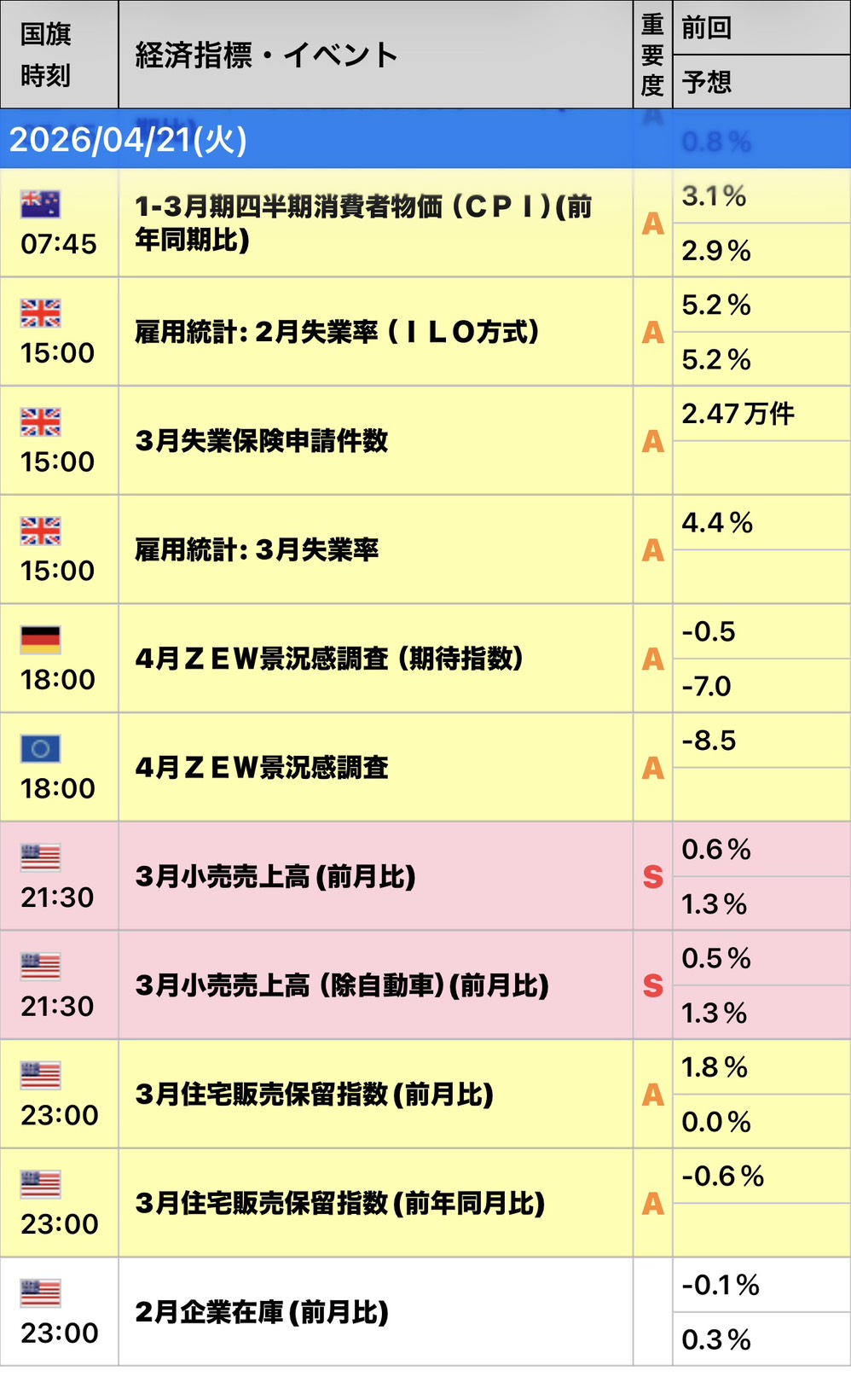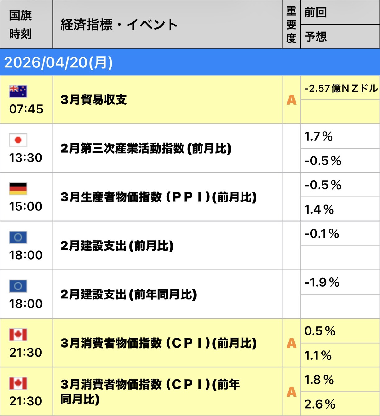 4月20日(月) ~ 4月24日(金) の経済指標カレンダー
